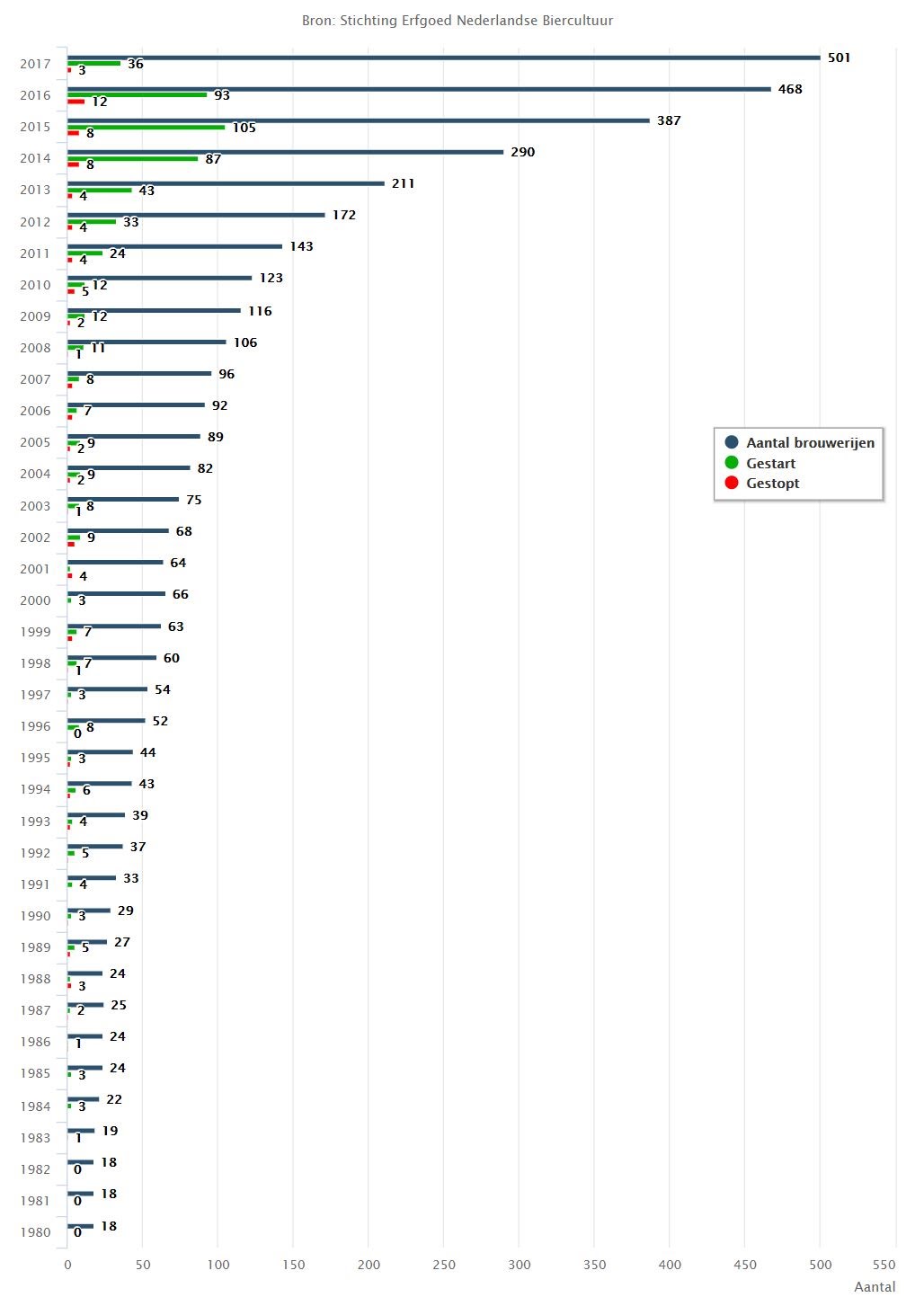 De groei van het aantal brouwerijen in Nederland is opmerkelijk. Begin jaren ’80 zat de biercultuur in Nederland qua aantal op een dieptepunt met ca. 20 brouwerijen. Twintig jaar later in 2000 was het aantal langzaam gegroeid naar 66. Pas de laatste zeventien jaar is de groei explosief geworden: In 2008 werd het aantal van 100 brouwerijen gepasseerd; in 2013 gingen we voorbij de 200-grens; in 2015 groeide de bierwereld naar 387 brouwerijen en nu, in augustus 2017, is de magische grens van 500 brouwerijen in ons land gepasseerd.